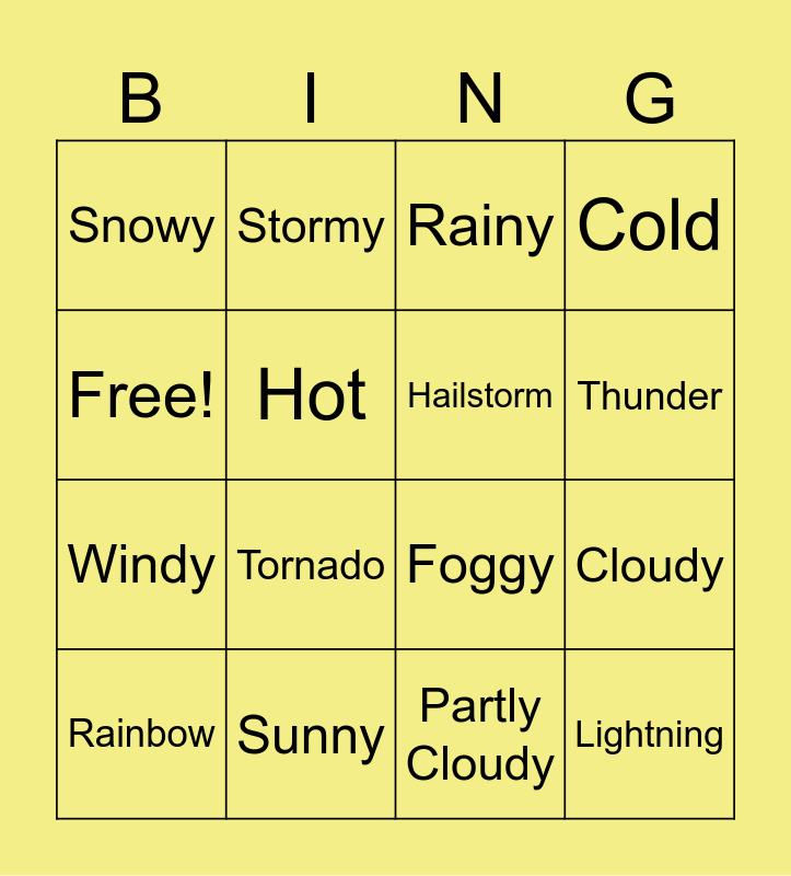 This bingo card has 16 words: Sunny, Cloudy, Rainy, Snowy, Windy, Stormy, Foggy, Partly Cloudy, Free!, Hot, Rainbow, Cold, Tornado, Thunder, Hailstorm and Lightning.