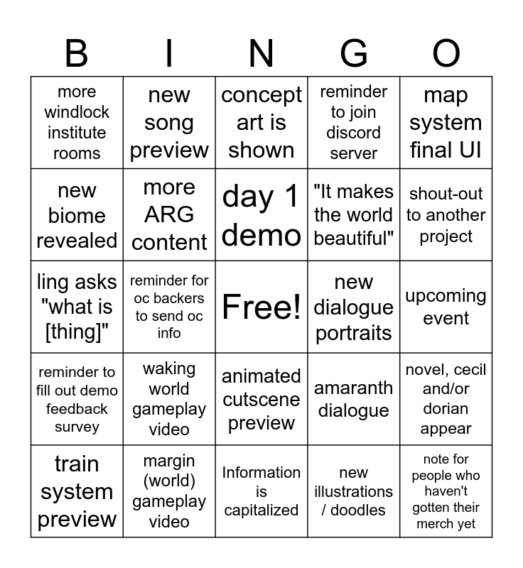 This bingo card has a free space and 24 words: waking world gameplay video, margin (world) gameplay video, day 1 demo, train system preview, map system final UI, more windlock institute rooms, new biome revealed, new song preview, new dialogue portraits, animated cutscene preview, "It makes the world beautiful", ling asks "what is [thing]", amaranth dialogue, novel, cecil and/or dorian appear, more ARG content, new illustrations / doodles, upcoming event, concept art is shown, shout-out to another project, reminder for oc backers to send oc info, note for people who haven't gotten their merch yet, reminder to fill out demo feedback survey, reminder to join discord server and Information is capitalized.
