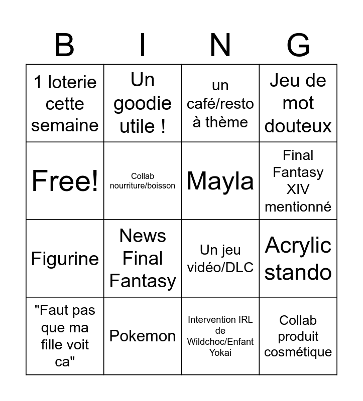 This bingo card has 16 words: Pokemon, Acrylic stando, un café/resto à thème, 1 loterie cette semaine, Figurine, Un goodie utile !, Un jeu vidéo/DLC, Intervention IRL de Wildchoc/Enfant Yokai, Free!, Collab nourriture/boisson, "Faut pas que ma fille voit ca", Jeu de mot douteux, News Final Fantasy, Final Fantasy XIV mentionné, Mayla and Collab produit cosmétique.