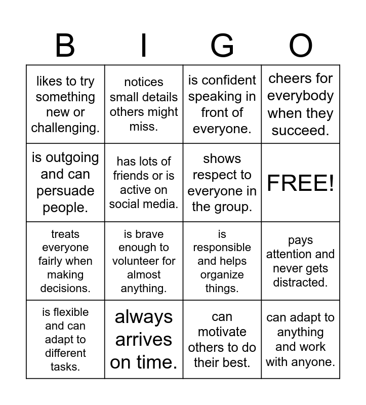 This bingo card has 16 words: always arrives on time., pays attention and never gets distracted., is confident speaking in front of everyone., likes to try something new or challenging., treats everyone fairly when making decisions., notices small details others might miss., is responsible and helps organize things., can motivate others to do their best., is outgoing and can persuade people., has lots of friends or is active on social media., is flexible and can adapt to different tasks., cheers for everybody when they succeed., is brave enough to volunteer for almost anything., FREE!, shows respect to everyone in the group. and can adapt to anything and work with anyone..
