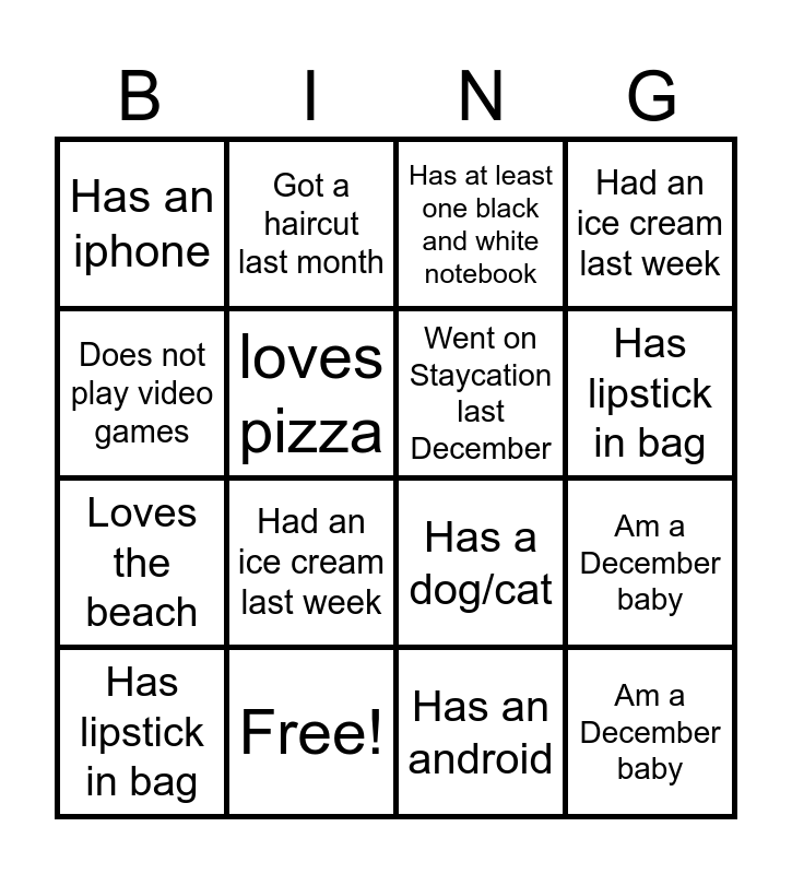 This bingo card has 31 words: Loves to cook/bake, Is an only child, Am a December baby, Wears glasses, Has an iphone, Has at least one black and white notebook, Went on Staycation last December, Got a haircut last month, Free!, loves pizza, Has an android, Has lipstick in bag, Has a cat, Is wearing Nikes, Had an ice cream last week, Has a dog, Loves to cook/bake, Is an only child, Am a December baby, Wears glasses, Does not play video games, Likes to sing, Has an iphone, Got a haircut last month, Loves the beach, loves pizza, Had an ice cream last week, Has a dog/cat, Is wearing sport shoes, Has lipstick in bag and FREE!.