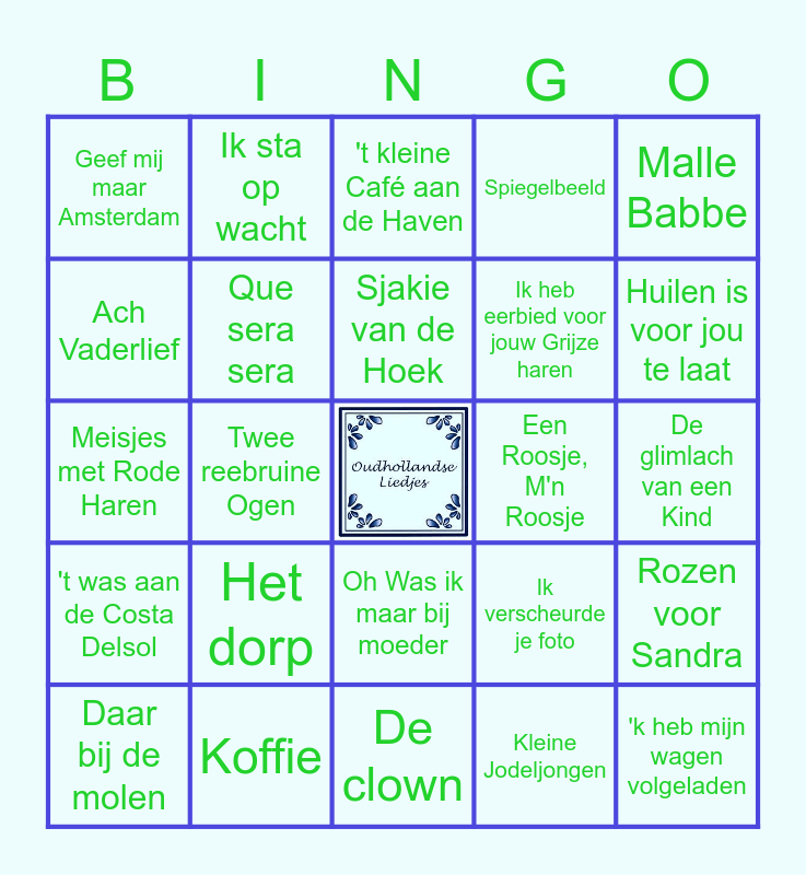 This bingo card has a free space and 29 words: Daar bij de molen, Brandend zand, Twee reebruine Ogen, Als de klok van Anrnemuiden, Geef mij maar Amsterdam, 't kleine Café aan de Haven, Que sera sera, Het dorp, Een Roosje, M'n Roosje, Koffie, De glimlach van een Kind, 'k heb mijn wagen volgeladen, De clown, Kleine Jodeljongen, Huilen is voor jou te laat, Manuela, Oh Was ik maar bij moeder, 't was aan de Costa Delsol, Malle Babbe, Meisjes met Rode Haren, Ik verscheurde je foto, De vlieger, Ik heb eerbied voor jouw Grijze haren, Ach Vaderlief, Spiegelbeeld, Ik sta op wacht, Rozen voor Sandra, Sjakie van de Hoek and Greetje uit de polder.