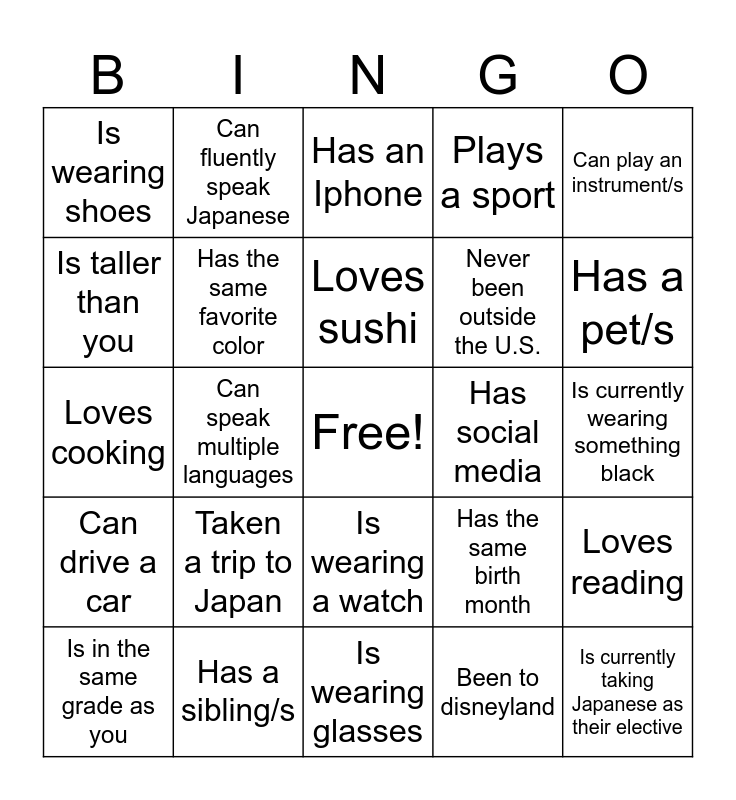 This bingo card has a free space and 24 words: Taken a trip to Japan, Has a sibling/s, Loves sushi, Is in the same grade as you, Can play an instrument/s, Is wearing shoes, Is taller than you, Can fluently speak Japanese, Has social media, Is wearing a watch, Never been outside the U.S., Loves cooking, Has the same birth month, Loves reading, Has the same favorite color, Been to disneyland, Is currently wearing something black, Has an Iphone, Has a pet/s, Can speak multiple languages, Is currently taking Japanese as their elective, Can drive a car, Plays a sport and Is wearing glasses.