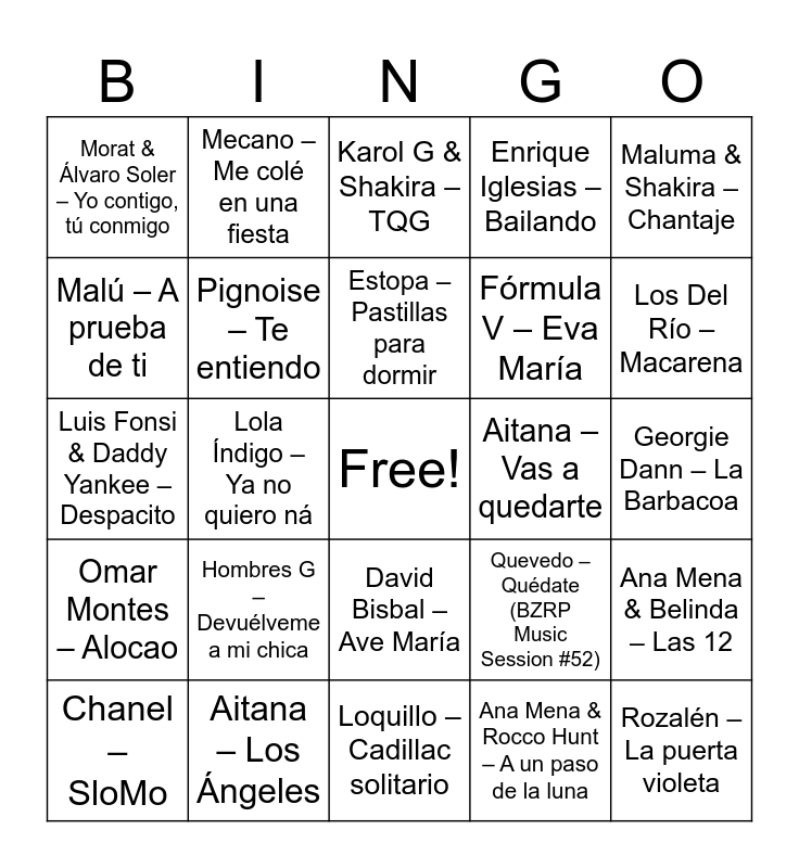 This bingo card has a free space and 35 words: Estopa – Como Camarón, Melendi – Caminando por la vida, Dani Martín – 16 añitos, Pignoise – Te entiendo, David Bisbal – Ave María, Enrique Iglesias – Bailando, Malú – A prueba de ti, Antonio Orozco – Lo sabes bien, Estopa – Pastillas para dormir, Fangoria – Dramas y comedias, Luis Fonsi & Daddy Yankee – Despacito, Maluma & Shakira – Chantaje, Álvaro Soler – Sofía, Juan Magán – Bailando por ahí, Morat & Álvaro Soler – Yo contigo, tú conmigo, Aitana – Vas a quedarte, Ana Mena & Rocco Hunt – A un paso de la luna, Lola Índigo – Ya no quiero ná, Omar Montes – Alocao, Rozalén – La puerta violeta, Quevedo – Quédate (BZRP Music Session #52), Chanel – SloMo, Ana Mena & Belinda – Las 12, Aitana – Los Ángeles, Karol G & Shakira – TQG, Los Del Río – Macarena, King África – Bomba, Raffaella Carrà – En el amor todo es empezar, Fórmula V – Eva María, Georgie Dann – La Barbacoa, Seguridad Social – Chiquilla, Loquillo – Cadillac solitario, Hombres G – Devuélveme a mi chica, Mecano – Me colé en una fiesta and Alaska y Dinarama – A quién le importa.