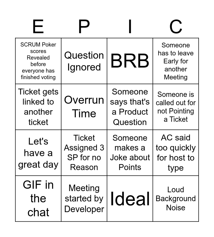 This bingo card has 27 words: Duplicate Ticket, Conscious of Time, Let's have a great day, Question Directed at David, Overrun Time, BRB, Question Ignored, Loud Background Noise, Meeting started by Developer, Someone Pivotal to refining the Ticket is not in the Meeting, Someone makes a Joke about Points, Someone has to leave Early for another Meeting, Dean says I don't know/Dean is doing something important and does not hear the question, Refreshing SCRUM Poker Over and Over again instead of just Clicking Delete Estimates, Ticket Assigned 3 SP for no Reason, Ticket gets Discarded, Someone says that's a Product Question, Someone is called out for not Pointing a Ticket, Release Train Mentioned, SCRUM Poker scores Revealed before everyone has finished voting, Ideal, "I'm just listening in", AC said too quickly for host to type, GIF in the chat, AWS Mentioned, Ticket gets linked to another ticket and Someone forgets to un-mute.
