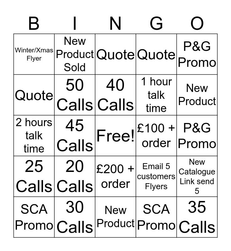 This bingo card has a free space and 24 words: 20 Calls, 30 Calls, 40 Calls, SCA Promo, P&G Promo, Winter/Xmas Flyer, Quote, New Product Sold, £100 + order, £200 + order, 1 hour talk time, 2 hours talk time, Email 5 customers Flyers, New Catalogue Link send 5, 50 Calls, SCA Promo, P&G Promo, Quote, New Product, 45 Calls, 35 Calls, 25 Calls, Quote and New Product.