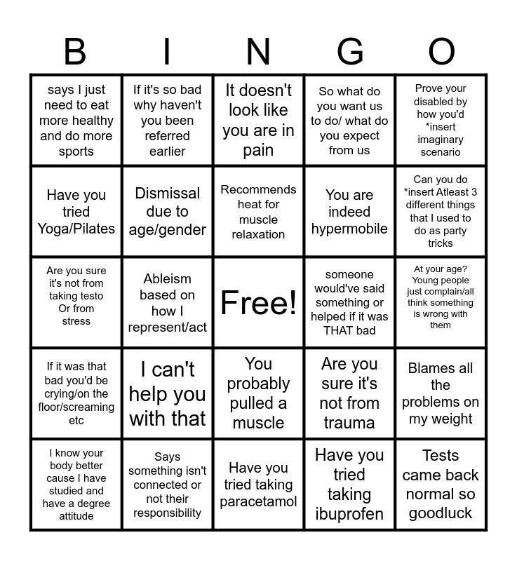 This bingo card has a free space and 24 words: I can't help you with that, Says something isn't connected or not their responsibility, Recommends heat for muscle relaxation, I know your body better cause I have studied and have a degree attitude, Prove your disabled by how you'd *insert imaginary scenario, says I just need to eat more healthy and do more sports, Have you tried Yoga/Pilates, If it's so bad why haven't you been referred earlier, someone would've said something or helped if it was THAT bad, You probably pulled a muscle, You are indeed hypermobile, Are you sure it's not from taking testo Or from stress, Are you sure it's not from trauma, Blames all the problems on my weight, Dismissal due to age/gender, Have you tried taking ibuprofen, At your age? Young people just complain/all think something is wrong with them, It doesn't look like you are in pain, Can you do *insert Atleast 3 different things that I used to do as party tricks, Ableism based on how I represent/act, Tests came back normal so goodluck, If it was that bad you'd be crying/on the floor/screaming etc, So what do you want us to do/ what do you expect from us and Have you tried taking paracetamol.