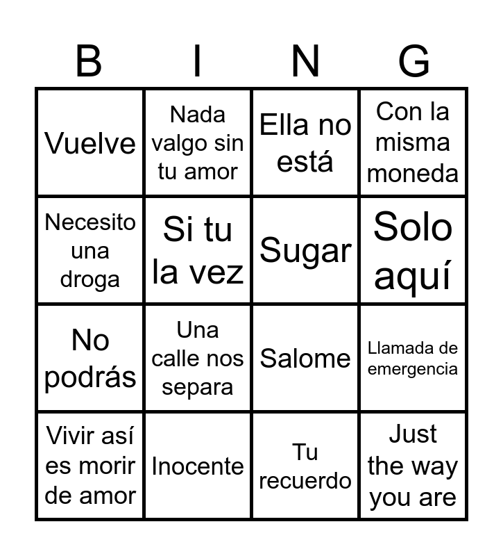 This bingo card has 72 words: Labios Compartidos, Nada valgo sin tu amor, Llamada de emergencia, Mayonesa, Un siglo sin ti, Me enamora, Con la misma moneda, La tortura, No podrás, Azul, Una lagrima sobre el teléfono, I will always love you, Una calle nos separa, Vuelve, Corazón Valiente, Salome, El parrandero, Necesito una droga, Te aviso te anuncio, Tu recuerdo, No me arrepiento de este amor, Vivir así es morir de amor, Runaway, 20 de Enero, La quiero a morir, El tren del cielo, Torero, Mentía, Guapas, We re all in this together, Angel, Fuego de noche, nieve de día, Sola otra vez, Ojalá, Vivir sin aire, Adicto, Borracho y loco, El mismo aire, Si tu la vez, Porque yo te amo, Please Please Please, Querida Yo, Ella usó mi cabeza como un revolver, Mi primavera, Beautiful Things, Just the way you are, Te mentiría, Y la hice llorar, Universo Paralelo, I´ll be there for you, Nunca soltamos, Easy on me, Como le digo, Inocente, Tanto amor, Yo te esperaré, Ella no está, Solo aquí, Nada cambiará mi amor por ti, Can´t help falling in love, She´s the one, Girls like you, Bed of roses, Jurabas tu, Hoy volví a verte, Como le digo, Sugar, Nada fue un error, Juntos a la par, Mariposa tecknicolor, Amazing and Every Breath you take.