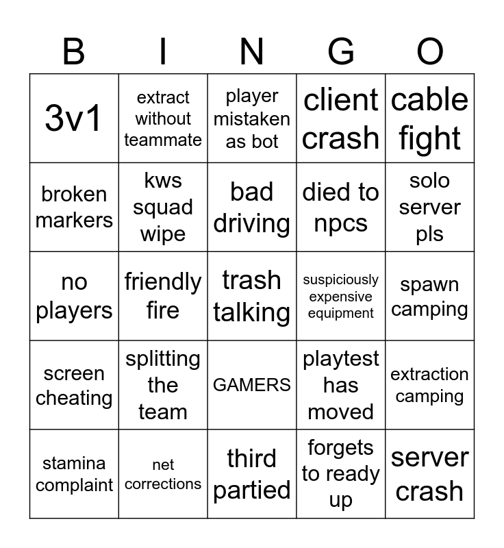 This bingo card has 27 words: playtest has moved, server crash, died to npcs, third partied, broken markers, player mistaken as bot, extract without teammate, screen cheating, suspiciously expensive equipment, extraction camping, no players, client crash, stamina complaint, net corrections, solo server pls, salt in feedback, kws squad wipe, bad driving, splitting the team, 3v1, spawn camping, forgets to ready up, friendly fire, trash talking, GAMERS, cable fight and didn't download playtest.