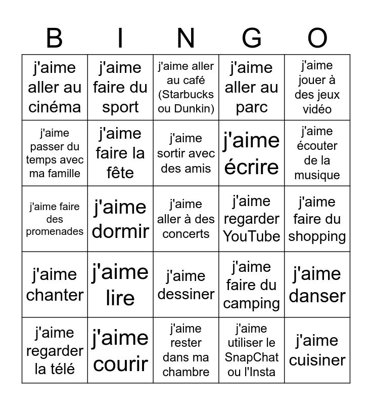 This bingo card has 25 words: j'aime lire, j'aime rester dans ma chambre, j'aime sortir avec des amis, j'aime regarder la télé, j'aime jouer à des jeux vidéo, j'aime aller au cinéma, j'aime passer du temps avec ma famille, j'aime faire du sport, j'aime regarder YouTube, j'aime dessiner, j'aime écrire, j'aime faire des promenades, j'aime faire du camping, j'aime danser, j'aime faire la fête, j'aime cuisiner, j'aime faire du shopping, j'aime aller au café (Starbucks ou Dunkin), j'aime écouter de la musique, j'aime dormir, j'aime aller à des concerts, j'aime courir, j'aime chanter, j'aime aller au parc and j'aime utiliser le SnapChat ou l'Insta.