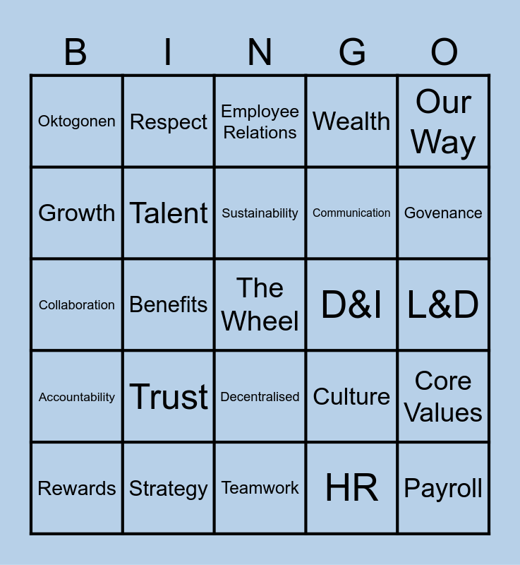 This bingo card has a free space and 24 words: Trust, Strategy, Sustainability, Rewards, Our Way, Oktogonen, Growth, Respect, D&I, Decentralised, Communication, Collaboration, Culture, Core Values, Talent, HR, L&D, Employee Relations, Govenance, Benefits, Payroll, Accountability, Wealth and Teamwork.