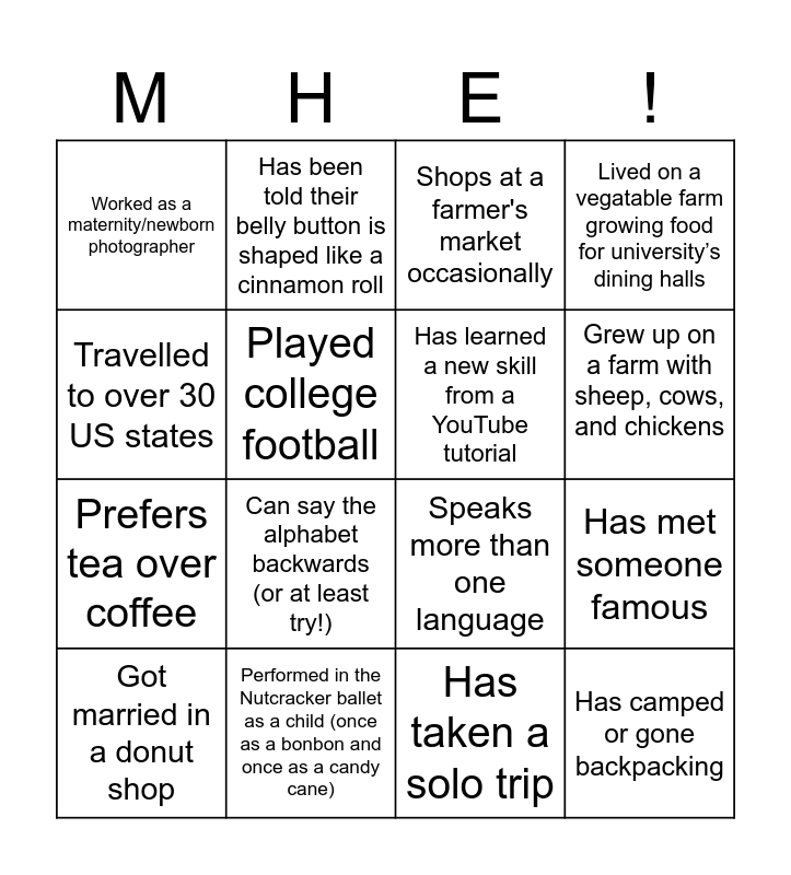 This bingo card has 16 words: Performed in the Nutcracker ballet as a child (once as a bonbon and once as a candy cane), Has met someone famous, Shops at a farmer's market occasionally, Worked as a maternity/newborn photographer, Prefers tea over coffee, Has been told their belly button is shaped like a cinnamon roll, Speaks more than one language, Has taken a solo trip, Travelled to over 30 US states, Played college football, Got married in a donut shop, Lived on a vegatable farm growing food for university’s dining halls, Can say the alphabet backwards (or at least try!), Grew up on a farm with sheep, cows, and chickens, Has learned a new skill from a YouTube tutorial and Has camped or gone backpacking.