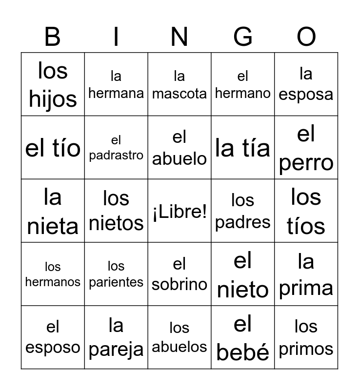 This bingo card has a free space and 29 words: el esposo, la madrastra, los nietos, la sobrina, los hijos, la mascota, el padrastro, los parientes, los padres, la pareja, los tíos, los primos, los abuelos, el bebé, el perro, el gato, el sobrino, los hermanos, la esposa, la nieta, el nieto, el primo, la tía, el tío, el hermano, la hermana, la prima, el abuelo and la abuela.