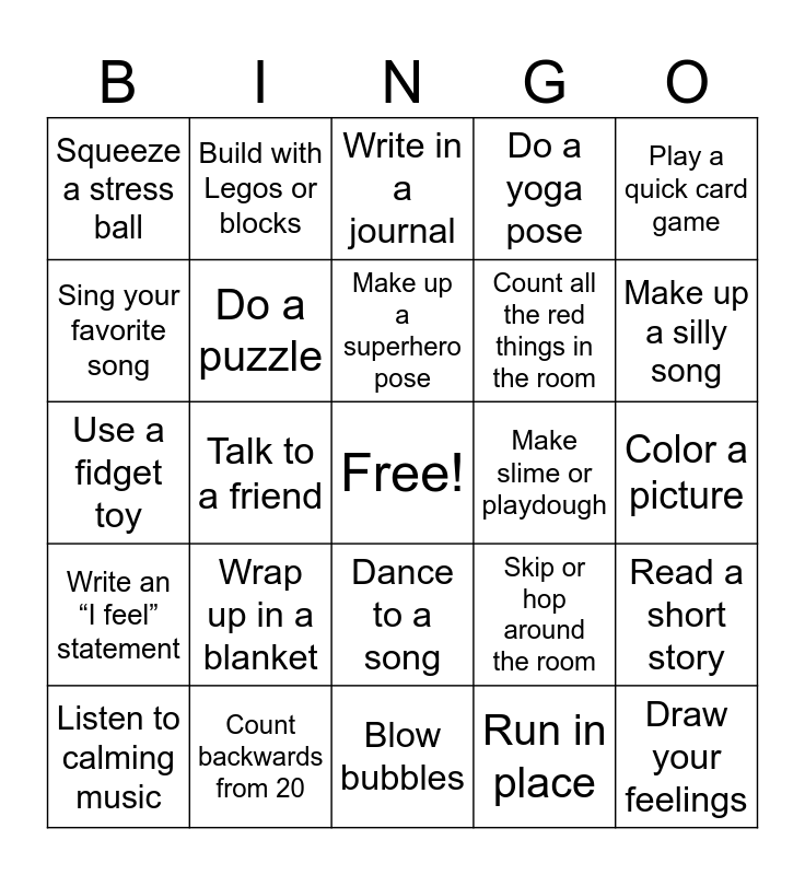 This bingo card has a free space and 45 words: Jumping jacks, Draw your feelings, Deep “dragon breaths”, Listen to calming music, Hug a stuffed animal, Run in place, Write in a journal, Punch a pillow, Play a quick card game, Count backwards from 20, Do a yoga pose, Make slime or playdough, Dance to a song, Wrap up in a blanket, Talk about what made you upset, Blow bubbles, Read a comic book, Use a fidget toy, Look for 5 things of one color, Make up a silly song, Build with Legos or blocks, Watch a funny video, Play charades, Squeeze a stress ball, Stretch like a cat, Color a picture, Count 10 slow breaths, Listen to nature sounds, Skip or hop around the room, Write an “I feel” statement, Dance freestyle, Read a short story, Draw with your non-dominant hand, Blanket burrito, Play tic-tac-toe, Talk to a friend, Pretend to blow up a balloon, Jump on one foot, Watch a silly animal video, Make up a superhero pose, Sing your favorite song, Count all the red things in the room, Use a squishy toy, Do a puzzle and Act out your favorite character.