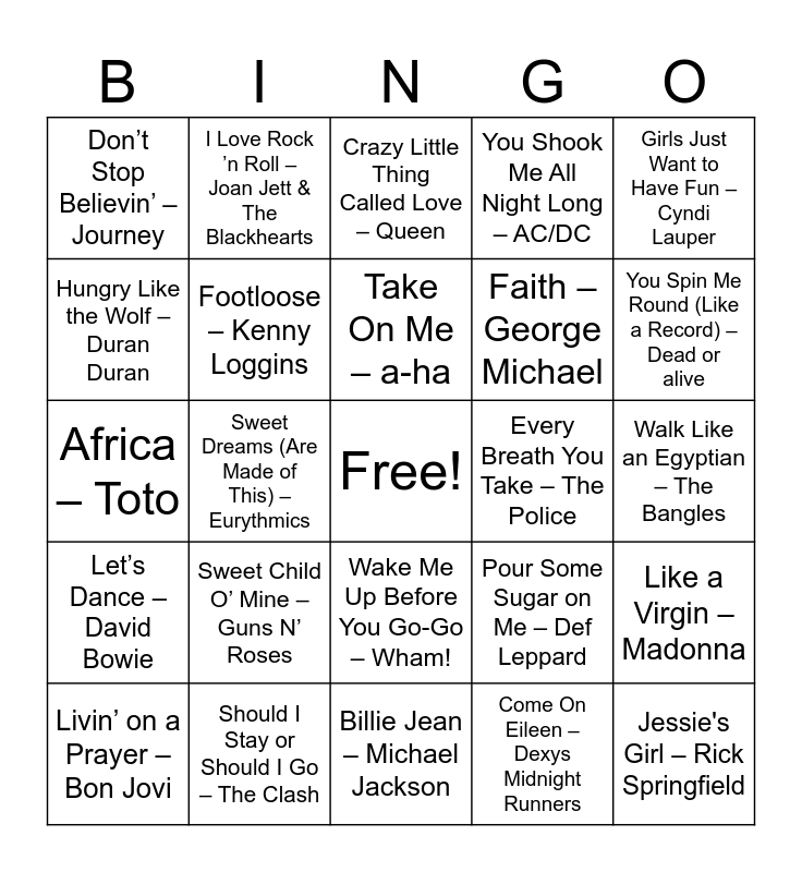 This bingo card has a free space and 25 words: Sweet Child O’ Mine – Guns N’ Roses, Billie Jean – Michael Jackson, Take On Me – a-ha, Livin’ on a Prayer – Bon Jovi, Girls Just Want to Have Fun – Cyndi Lauper, Don’t Stop Believin’ – Journey, Hungry Like the Wolf – Duran Duran, I Love Rock ’n Roll – Joan Jett & The Blackhearts, Every Breath You Take – The Police, Wake Me Up Before You Go-Go – Wham!, Faith – George Michael, Africa – Toto, Pour Some Sugar on Me – Def Leppard, Like a Virgin – Madonna, Footloose – Kenny Loggins, Never Gonna Give You Up – Rick Astley, Walk Like an Egyptian – The Bangles, Crazy Little Thing Called Love – Queen, You Spin Me Round (Like a Record) – Dead or alive, Sweet Dreams (Are Made of This) – Eurythmics, Jessie's Girl – Rick Springfield, Should I Stay or Should I Go – The Clash, Let’s Dance – David Bowie, You Shook Me All Night Long – AC/DC and Come On Eileen – Dexys Midnight Runners.