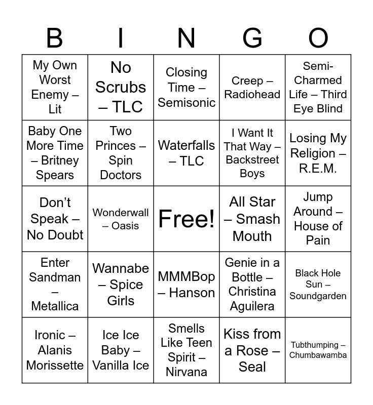 This bingo card has a free space and 25 words: Wannabe – Spice Girls, Smells Like Teen Spirit – Nirvana, Waterfalls – TLC, Ironic – Alanis Morissette, Semi-Charmed Life – Third Eye Blind, My Own Worst Enemy – Lit, Baby One More Time – Britney Spears, No Scrubs – TLC, All Star – Smash Mouth, MMMBop – Hanson, I Want It That Way – Backstreet Boys, Don’t Speak – No Doubt, Genie in a Bottle – Christina Aguilera, Black Hole Sun – Soundgarden, Two Princes – Spin Doctors, Killing Me Softly – Fugees, Jump Around – House of Pain, Closing Time – Semisonic, Losing My Religion – R.E.M., Wonderwall – Oasis, Tubthumping – Chumbawamba, Ice Ice Baby – Vanilla Ice, Enter Sandman – Metallica, Creep – Radiohead and Kiss from a Rose – Seal.