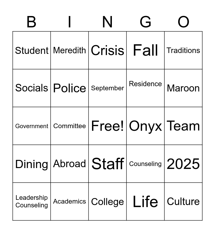 This bingo card has a free space and 29 words: Leadership Counseling, Admin, Committee, Services, Student, Crisis, Police, Abroad, Onyx, Academics, Team, Culture, College, Life, Maroon, Community, Staff, Dining, Traditions, Government, Counseling, Forum, Residence, Socials, Fall, Meredith, 2025, September and Bingo.