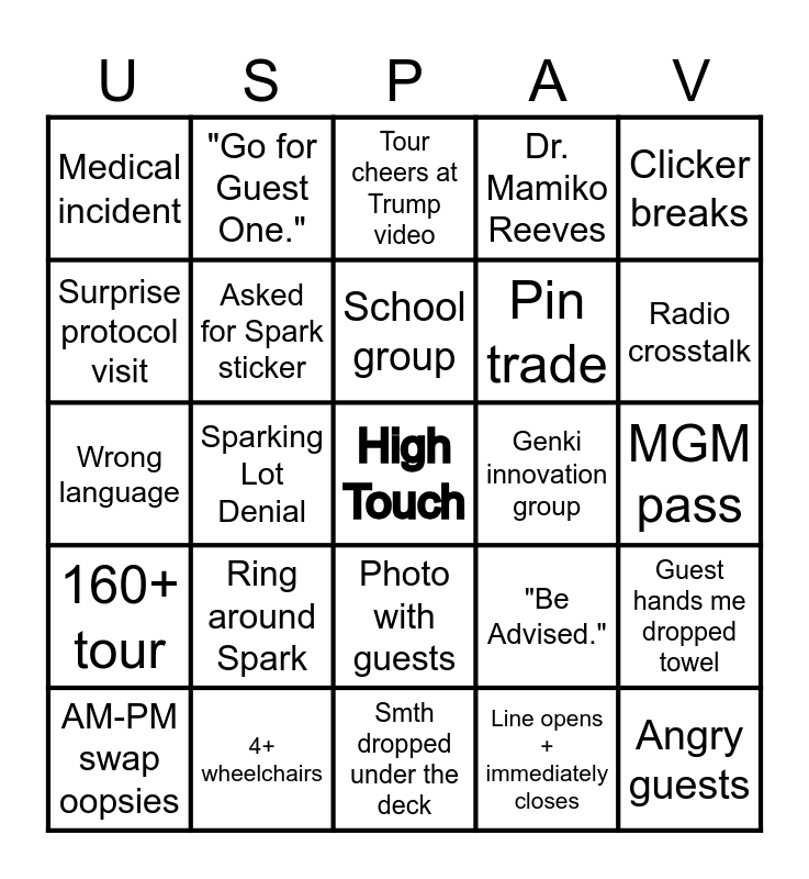This bingo card has a free space and 24 words: Ring around Spark, 4+ wheelchairs, School group, AM-PM swap oopsies, Clicker breaks, Medical incident, Surprise protocol visit, "Go for Guest One.", Genki innovation group, Photo with guests, Pin trade, Wrong language, "Be Advised.", Guest hands me dropped towel, Asked for Spark sticker, Line opens + immediately closes, MGM pass, Tour cheers at Trump video, Radio crosstalk, Sparking Lot Denial, Angry guests, 160+ tour, Dr. Mamiko Reeves and Smth dropped under the deck.