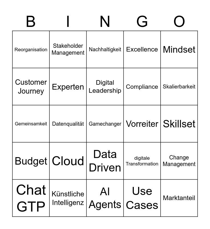 This bingo card has a free space and 29 words: Chat GTP, außergewöhnlich, Datenqualität, Agilität, Reorganisation, Nachhaltigkeit, Experten, Cloud, Vorreiter, Künstliche Intelligenz, Skillset, Marktanteil, AI Agents, Use Cases, Skalierbarkeit, Chatbot, Data Driven, Budget, Mindset, Gemeinsamkeit, digitale Transformation, Kundenfokussiert, Compliance, Customer Journey, Excellence, Stakeholder Management, Change Management, Digital Leadership and Empowerment.