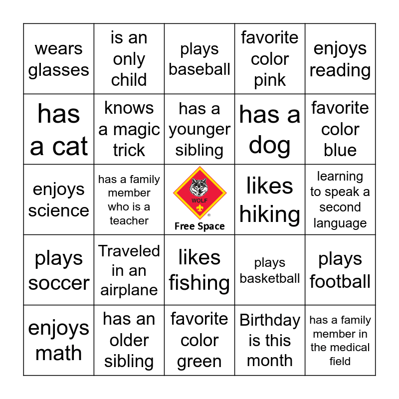 This bingo card has a free space and 24 words: Traveled in an airplane, has an older sibling, has a younger sibling, enjoys math, enjoys reading, wears glasses, has a cat, is an only child, likes hiking, likes fishing, has a dog, enjoys science, plays basketball, plays football, knows a magic trick, Birthday is this month, learning to speak a second language, plays baseball, favorite color blue, has a family member who is a teacher, has a family member in the medical field, plays soccer, favorite color pink and favorite color green.