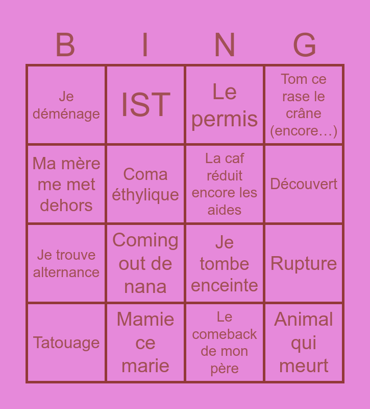 This bingo card has 16 words: Mamie ce marie, Rupture, Le permis, Je déménage, Je trouve alternance, IST, Je tombe enceinte, Le comeback de mon père, Ma mère me met dehors, Coma éthylique, Tatouage, Tom ce rase le crâne (encore…), Coming out de nana, Découvert, La caf réduit encore les aides and Animal qui meurt.