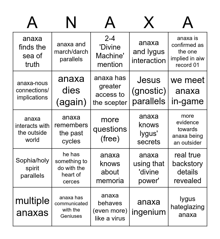 This bingo card has a free space and 24 words: he has something to do with the heart of cerces, anaxa has communicated with the Geniuses, anaxa has greater access to the scepter, multiple anaxas, anaxa is confirmed as the one implied in aiw record 01, anaxa finds the sea of truth, anaxa-nous connections/ implications, anaxa and march/darch parallels, anaxa knows lygus' secrets, anaxa knows about memoria, Jesus (gnostic) parallels, anaxa interacts with the outside world, anaxa using that 'divine power', real true backstory details revealed, anaxa dies (again), anaxa ingenium, more evidence towards anaxa being an outsider, 2-4 'Divine Machine' mention, we meet anaxa in-game, anaxa remembers the past cycles, lygus hateglazing anaxa, Sophia/holy spirit parallels, anaxa and lygus interaction and anaxa behaves (even more) like a virus.