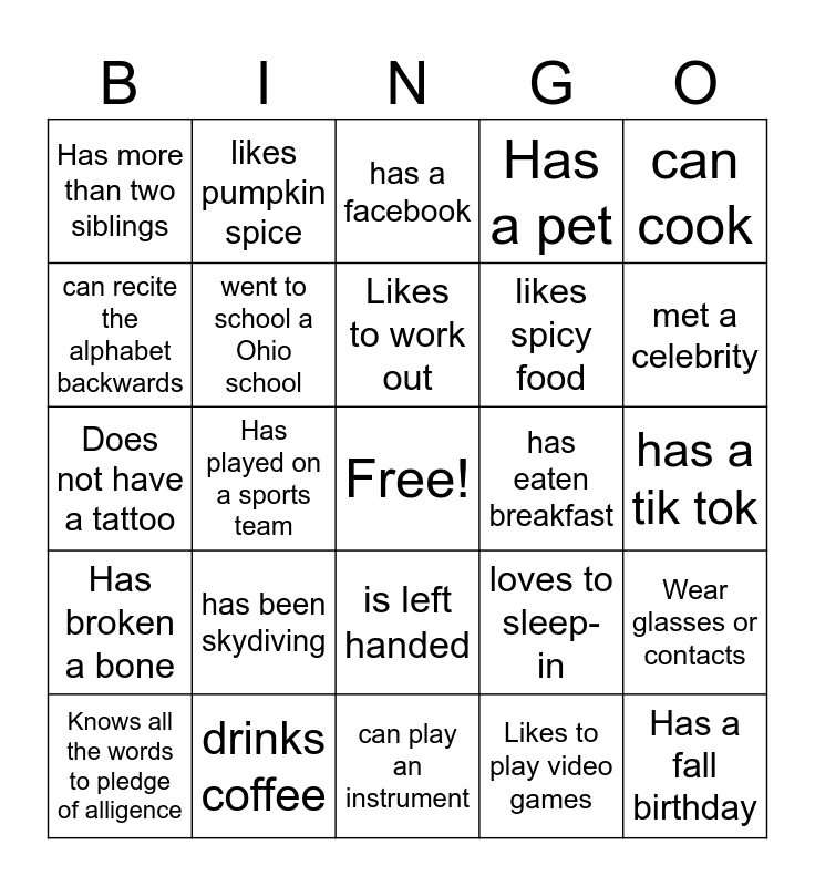 This bingo card has a free space and 39 words: can speak another language, Has traveled to another country, has read all 7 Harry Potter books, went to school a Ohio school, Knows all the words to pledge of alligence, is left handed, Likes to work out, Has a tattoo, can cook, Has broken a bone, Has played on a sports team, Has a pet, Has a fall birthday, has a tik tok, has eaten breakfast, has been skydiving, Has started decorating for Halloween, Has more than two siblings, has kids, loves to sleep-in, can recite the alphabet backwards, can play an instrument, likes spicy food, met a celebrity, Has a summer birthday, can sing, can dance, can draw, favorite color is blue, likes pumpkin spice, favorite season is winter, plays pokemon go, has a facebook, drinks coffee, Likes to play video games, Has chickens, Wear glasses or contacts, Does not have a tattoo and Can drive a manual.