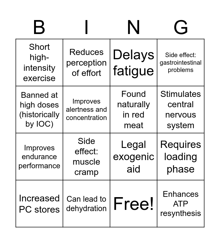 This bingo card has 17 words: Free!, Increased PC stores, Delays fatigue, Short high-intensity exercise, Side effect: muscle cramp, Side effect: gastrointestinal problems, Requires loading phase, Found naturally in red meat, Stimulates central nervous system, Improves alertness and concentration, Can lead to dehydration, Legal exogenic aid, Banned at high doses (historically by IOC), Reduces perception of effort, Improves endurance performance, Headaches as a side effect and Enhances ATP resynthesis.