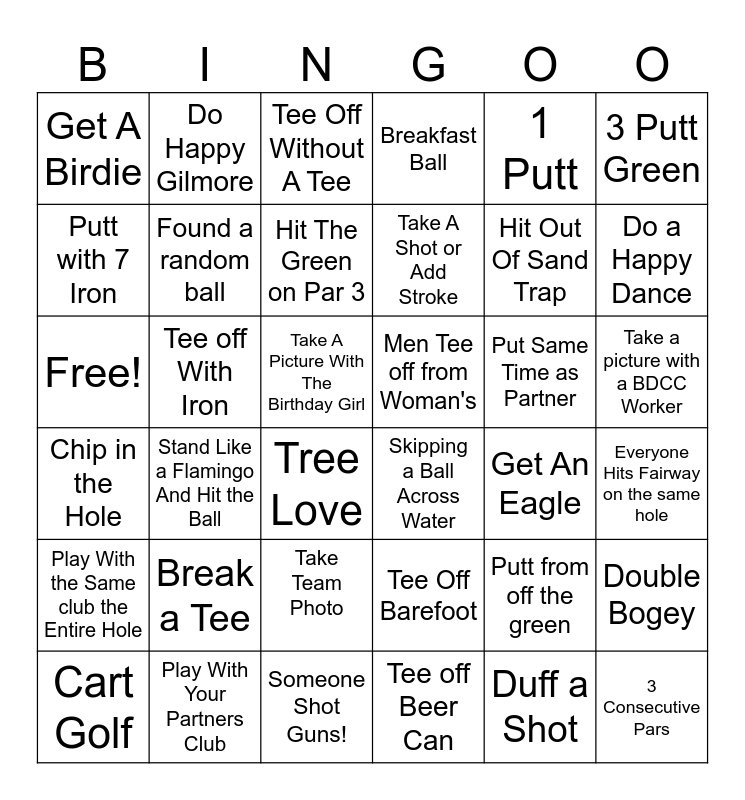 This bingo card has 36 words: Tee Off Barefoot, Take Team Photo, Tee off Beer Can, Putt with 7 Iron, Chip in the Hole, Men Tee off from Woman's, Found a random ball, Someone Shot Guns!, 1 Putt, Putt from off the green, Do a Happy Dance, Breakfast Ball, Double Bogey, Tee off With Iron, Take A Shot or Add Stroke, Get A Birdie, Play With the Same club the Entire Hole, Put Same Time as Partner, Free!, Tee Off Without A Tee, Take A Picture With The Birthday Girl, Stand Like a Flamingo And Hit the Ball, Skipping a Ball Across Water, Tree Love, Get An Eagle, Do Happy Gilmore, Hit Out Of Sand Trap, Play With Your Partners Club, Hit The Green on Par 3, 3 Putt Green, 3 Consecutive Pars, Cart Golf, Everyone Hits Fairway on the same hole, Take a picture with a BDCC Worker, Break a Tee and Duff a Shot.