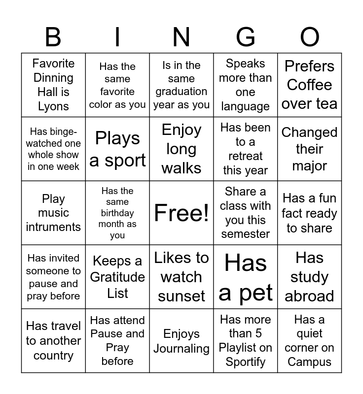 This bingo card has a free space and 24 words: Keeps a Gratitude List, Has attend Pause and Pray before, Enjoy long walks, Has travel to another country, Prefers Coffee over tea, Favorite Dinning Hall is Lyons, Has binge-watched one whole show in one week, Has the same favorite color as you, Share a class with you this semester, Likes to watch sunset, Has been to a retreat this year, Play music intruments, Has a pet, Has study abroad, Plays a sport, Has more than 5 Playlist on Sportify, Has a fun fact ready to share, Is in the same graduation year as you, Changed their major, Has the same birthday month as you, Has a quiet corner on Campus, Has invited someone to pause and pray before, Speaks more than one language and Enjoys Journaling.