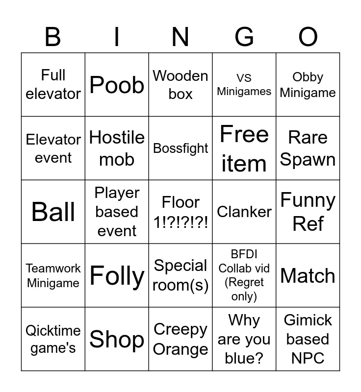 This bingo card has a free space and 24 words: Folly, Shop, Bossfight, Qicktime game's, Obby Minigame, Full elevator, Elevator event, Poob, Clanker, Special room(s), Free item, Ball, BFDI Collab vid (Regret only), Match, Hostile mob, Why are you blue?, Funny Ref, Wooden box, Rare Spawn, Player based event, Gimick based NPC, Teamwork Minigame, VS Minigames and Creepy Orange.