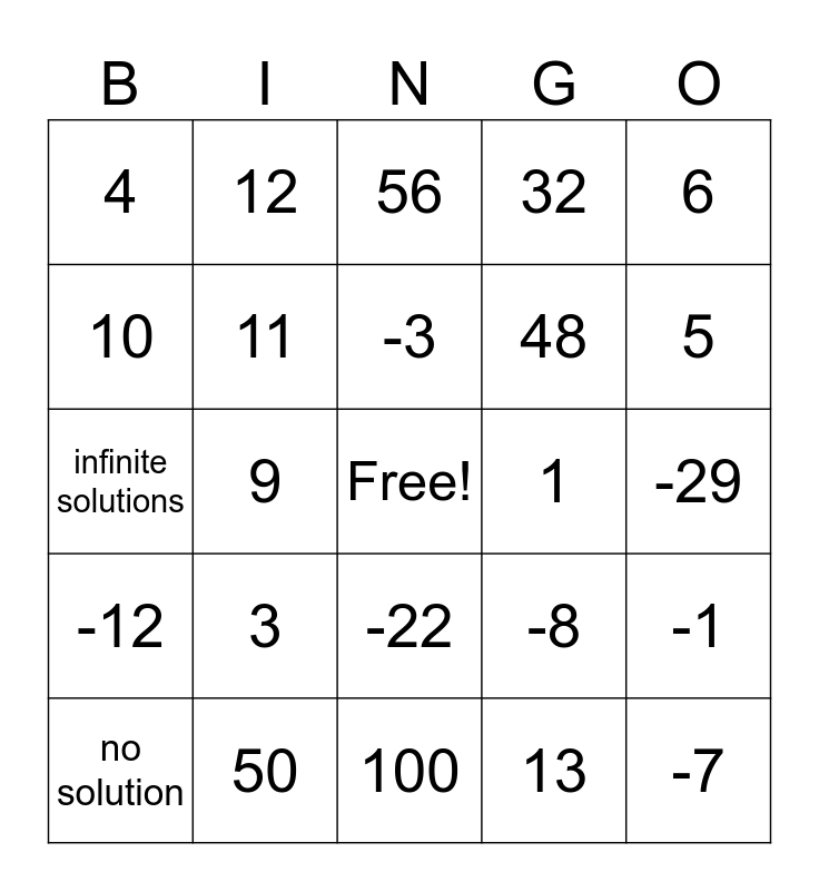 This bingo card has a free space and 24 words: 3, 50, -3, no solution, 6, 4, 10, 12, 1, -22, 48, infinite solutions, -8, -1, 11, 13, -29, 56, 5, 9, -7, -12, 32 and 100.