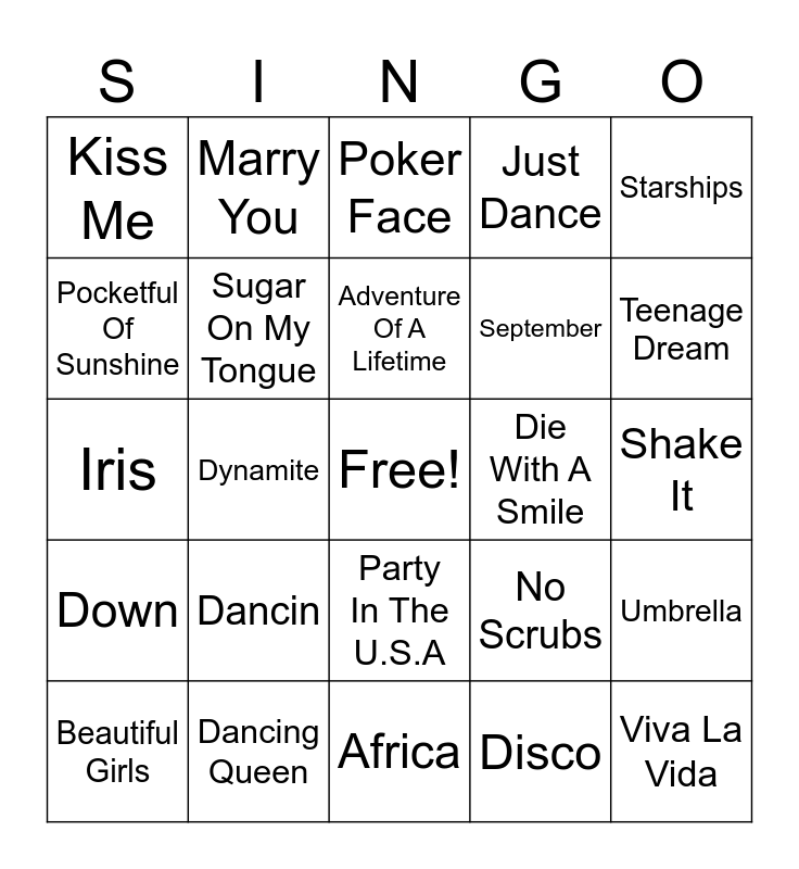 This bingo card has a free space and 37 words: Sienna, From The Start, Lovefool, Sugar On My Tongue, Umbrella, Dancin, Adventure Of A Lifetime, Super Bass, Starships, Better Place, Dynamite, Just Dance, Viva La Vida, Shake It, Pocketful Of Sunshine, Down, Like A G6, Poker Face, Party In The U.S.A, Die With A Smile, Kiss Me, Teenage Dream, Beautiful Girls, Africa, Duvet, Disco, Marry You, Oops! I Did It Again, Love You Like A Love Song, On The Floor, I Want It That Way, Dancing Queen, Iris, Mr.Saxobeat, No Scrubs, September and Como La Flor.