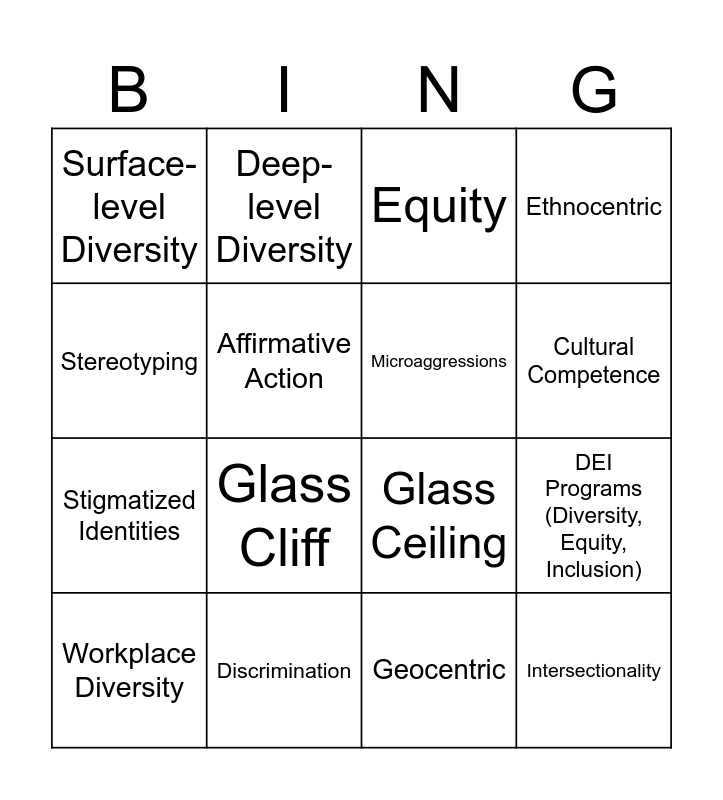 This bingo card has 20 words: DEI Programs (Diversity, Equity, Inclusion), Diversity, Equity, Inclusion, Workplace Diversity, Stereotyping, Discrimination, Surface-level Diversity, Stigmatized Identities, Deep-level Diversity, Glass Cliff, Glass Ceiling, Affirmative Action, Intersectionality, Microaggressions, Implicit Bias, Cultural Competence, Ethnocentric, Geocentric and Cultural Intelligence.