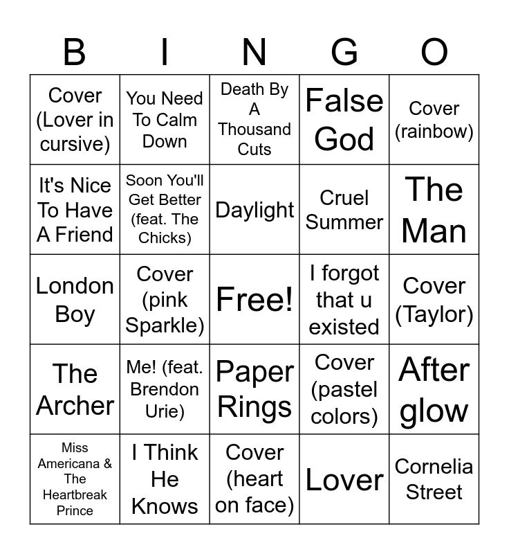 This bingo card has a free space and 24 words: Me! (feat. Brendon Urie), I Think He Knows, Daylight, Miss Americana & The Heartbreak Prince, Cover (rainbow), Cover (Lover in cursive), It's Nice To Have A Friend, You Need To Calm Down, I forgot that u existed, Paper Rings, Cruel Summer, London Boy, Cover (pastel colors), After glow, Soon You'll Get Better (feat. The Chicks), Lover, Cover (Taylor), Death By A Thousand Cuts, The Man, Cover (pink Sparkle), Cornelia Street, The Archer, False God and Cover (heart on face).
