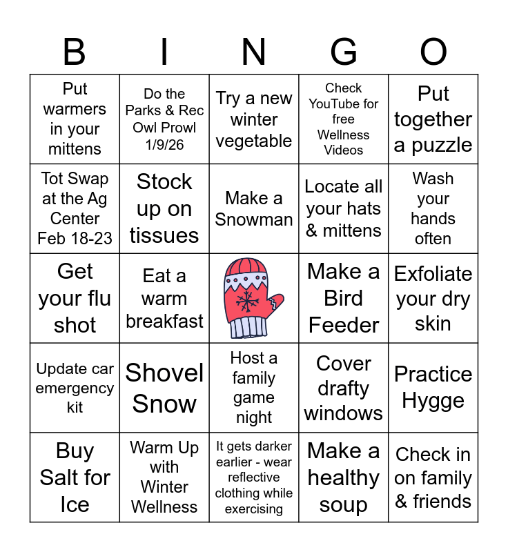 This bingo card has a free space and 24 words: Shovel Snow, Warm Up with Winter Wellness, Make a Snowman, Buy Salt for Ice, Put together a puzzle, Put warmers in your mittens, Tot Swap at the Ag Center Feb 18-23, Do the Parks & Rec Owl Prowl 1/9/26, Make a Bird Feeder, Host a family game night, Locate all your hats & mittens, Get your flu shot, Cover drafty windows, Practice Hygge, Stock up on tissues, Make a healthy soup, Exfoliate your dry skin, Try a new winter vegetable, Wash your hands often, Eat a warm breakfast, Check in on family & friends, Update car emergency kit, Check YouTube for free Wellness Videos and It gets darker earlier - wear reflective clothing while exercising.