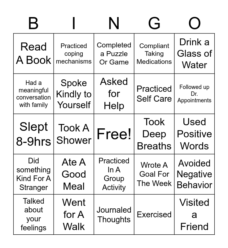 This bingo card has a free space and 24 words: Ate A Good Meal, Went for A Walk, Asked for Help, Talked about your feelings, Drink a Glass of Water, Read A Book, Had a meaningful conversation with family, Practiced coping mechanisms, Took Deep Breaths, Practiced In A Group Activity, Practiced Self Care, Slept 8-9hrs, Wrote A Goal For The Week, Avoided Negative Behavior, Spoke Kindly to Yourself, Exercised, Used Positive Words, Completed a Puzzle Or Game, Followed up Dr. Appointments, Took A Shower, Visited a Friend, Did something Kind For A Stranger, Compliant Taking Medications and Journaled Thoughts.
