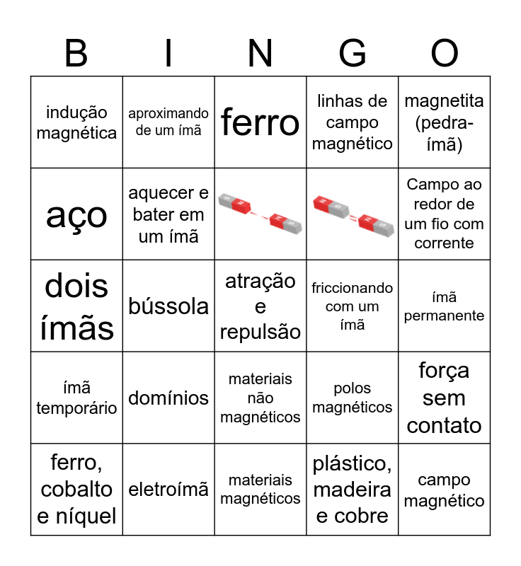 This bingo card has 2 images and 23 words: domínios, materiais magnéticos, ferro, cobalto e níquel, magnetita (pedra-ímã), indução magnética, aço, aproximando de um ímã, friccionando com um ímã, materiais não magnéticos, dois ímãs, polos magnéticos, força sem contato, aquecer e bater em um ímã, campo magnético, ímã permanente, ferro, Campo ao redor de um fio com corrente, bússola, atração e repulsão, eletroímã, ímã temporário, linhas de campo magnético and plástico, madeira e cobre.