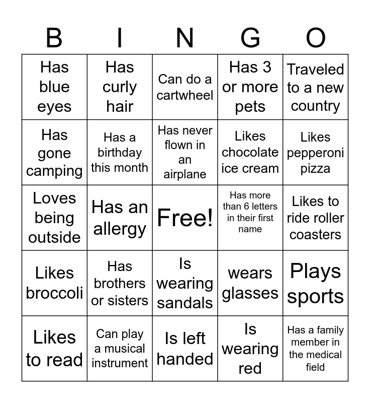 This bingo card has a free space and 24 words: Has brothers or sisters, Can play a musical instrument, Has never flown in an airplane, Likes to read, Traveled to a new country, Has blue eyes, Has gone camping, Has curly hair, Has more than 6 letters in their first name, Is wearing sandals, Likes chocolate ice cream, Loves being outside, wears glasses, Plays sports, Has a birthday this month, Is wearing red, Likes to ride roller coasters, Can do a cartwheel, Likes pepperoni pizza, Has an allergy, Has a family member in the medical field, Likes broccoli, Has 3 or more pets and Is left handed.