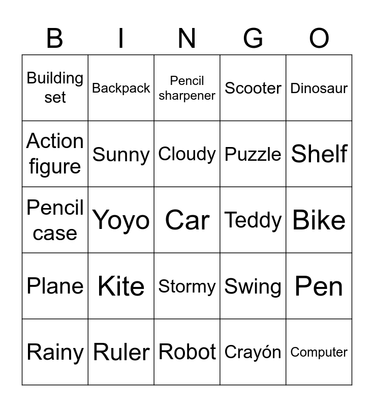 This bingo card has 39 words: Free!, Cold, Hot, Sunny, Rainy, Stormy, Cloudy, Ball, Dinosaur, Plane, Yoyo, Scooter, Car, Bike, Teddy, Kite, Slide, Building set, Doll, Swing, Action figure, Robot, Puzzle, Shelf, Cupboard, Chair, Computer, Desk, Table, Backpack, Scissors, Rubber, Pencil sharpener, Ruler, Crayón, Pencil, Pen, Pencil case and Book.
