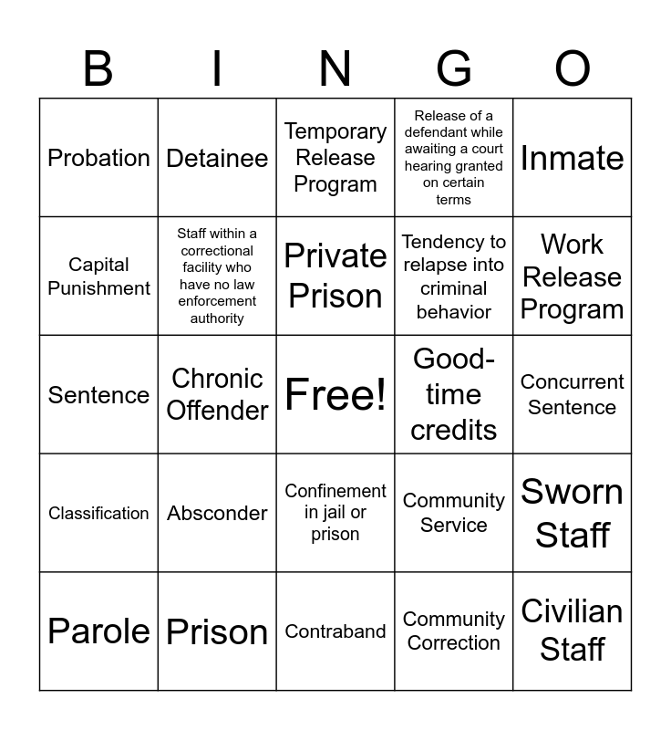 This bingo card has a free space and 24 words: Absconder, Prison, Private Prison, Parole, Inmate, Probation, Capital Punishment, Detainee, Good-time credits, Confinement in jail or prison, Tendency to relapse into criminal behavior, Sentence, Community Service, Sworn Staff, Staff within a correctional facility who have no law enforcement authority, Community Correction, Concurrent Sentence, Temporary Release Program, Work Release Program, Chronic Offender, Civilian Staff, Classification, Release of a defendant while awaiting a court hearing granted on certain terms and Contraband.