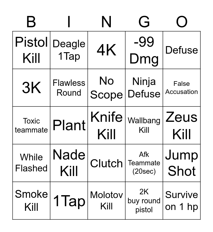 This bingo card has a free space and 24 words: Nade Kill, 1Tap, No Scope, Smoke Kill, Defuse, Pistol Kill, 3K, Deagle 1Tap, Wallbang Kill, Clutch, Ninja Defuse, Toxic teammate, Afk Teammate (20sec), Jump Shot, Flawless Round, 2K buy round pistol, Zeus Kill, 4K, False Accusation, Plant, Survive on 1 hp, While Flashed, -99 Dmg and Molotov Kill.