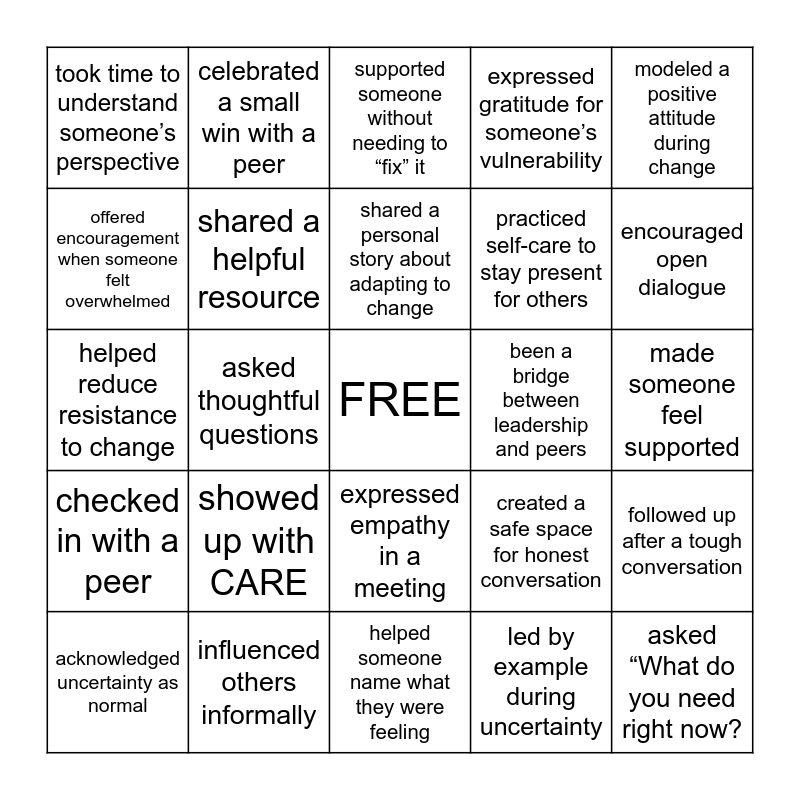 This bingo card has a free space and 33 words: asked someone how they’re feeling about a change, encouraged a teammate during a tough transition, asked thoughtful questions, helped someone explore new possibilities, checked in with a peer, shared a helpful resource, modeled a positive attitude during change, acknowledged uncertainty as normal, celebrated a small win with a peer, reflected on my own change journey, shared a personal story about adapting to change, supported someone without needing to “fix” it, took a small action to support change, helped someone feel heard, been a bridge between leadership and peers, encouraged open dialogue, influenced others informally, helped reduce resistance to change, showed up with CARE, created a safe space for honest conversation, expressed empathy in a meeting, validated someone’s emotions, took time to understand someone’s perspective, made someone feel supported, helped someone name what they were feeling, asked “What do you need right now?, expressed gratitude for someone’s vulnerability, practiced self-care to stay present for others, offered encouragement when someone felt overwhelmed, followed up after a tough conversation, invited feedback on a project or change initiative, led by example during uncertainty and Listened without interrupting.