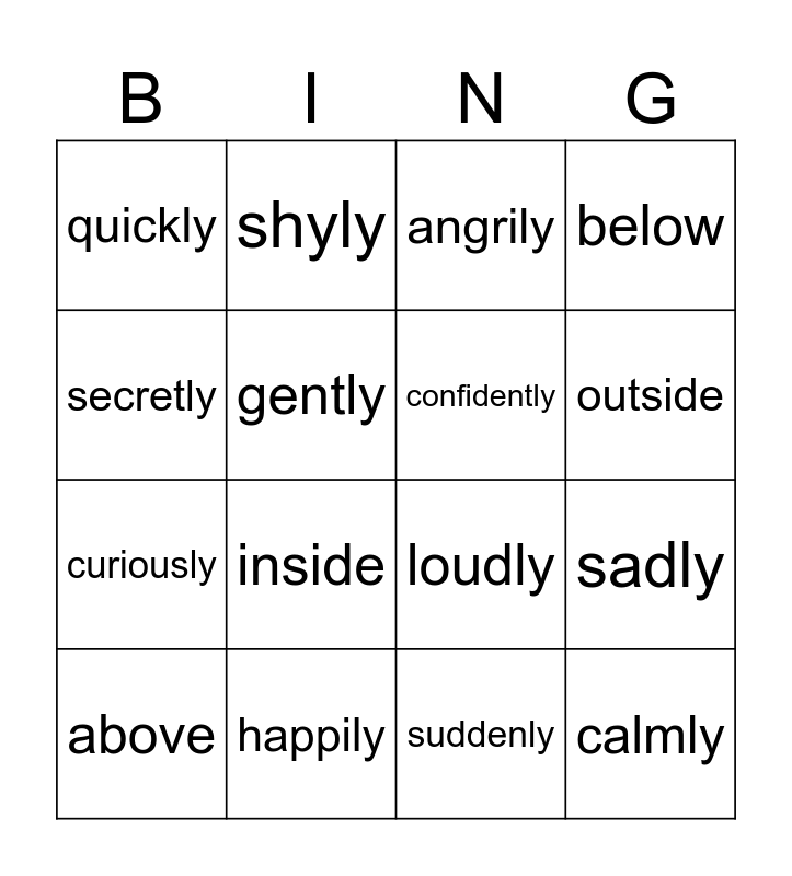 This bingo card has 16 words: happily, sadly, angrily, quickly, curiously, shyly, loudly, suddenly, secretly, gently, above, below, inside, outside, confidently and calmly.