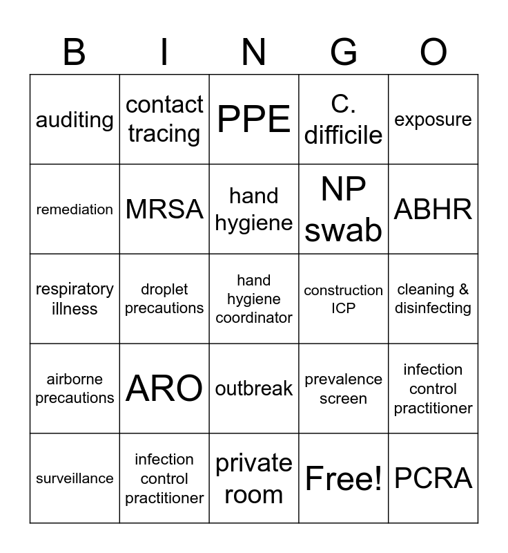This bingo card has 32 words: Free!, community acquired, droplet precautions, respiratory season, airborne precautions, MRSA, exposure, infection control practitioner, contact tracing, PCRA, hand hygiene, PPE, IPAC physician, nosocomial, construction ICP, epidemiologist, surveillance, respiratory illness, outbreak, ARO, prevalence screen, routine precautions, cleaning & disinfecting, infection control practitioner, hand hygiene coordinator, C. difficile, NP swab, remediation, auditing, private room, negative pressure and ABHR.