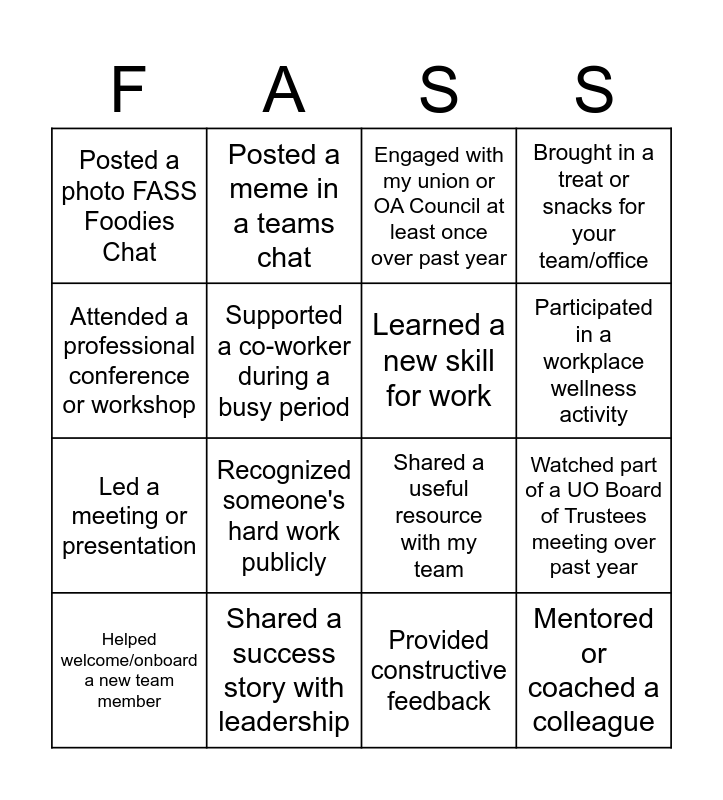This bingo card has 16 words: Shared a success story with leadership, Watched part of a UO Board of Trustees meeting over past year, Engaged with my union or OA Council at least once over past year, Posted a photo FASS Foodies Chat, Led a meeting or presentation, Posted a meme in a teams chat, Shared a useful resource with my team, Provided constructive feedback, Attended a professional conference or workshop, Supported a co-worker during a busy period, Helped welcome/onboard a new team member, Brought in a treat or snacks for your team/office, Recognized someone's hard work publicly, Participated in a workplace wellness activity, Learned a new skill for work and Mentored or coached a colleague.