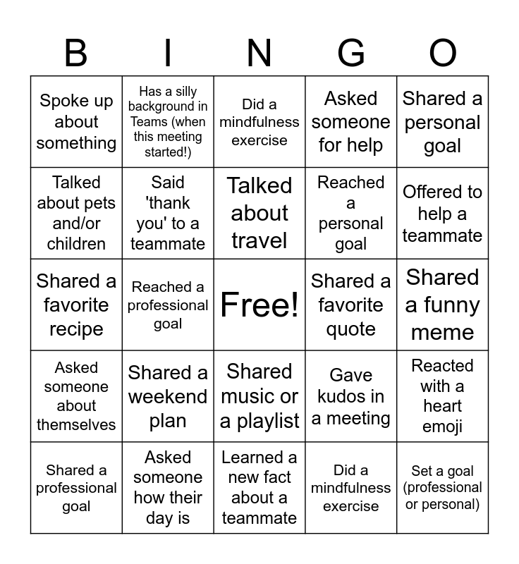 This bingo card has a free space and 25 words: Shared a weekend plan, Learned a new fact about a teammate, Talked about travel, Shared a professional goal, Shared a personal goal, Spoke up about something, Talked about pets and/or children, Has a silly background in Teams (when this meeting started!), Shared a favorite quote, Shared music or a playlist, Reached a personal goal, Shared a favorite recipe, Gave kudos in a meeting, Reacted with a heart emoji, Said 'thank you' to a teammate, Encouraged someone, Shared a funny meme, Did a mindfulness exercise, Offered to help a teammate, Reached a professional goal, Set a goal (professional or personal), Asked someone how their day is, Asked someone about themselves, Asked someone for help and Did a mindfulness exercise.