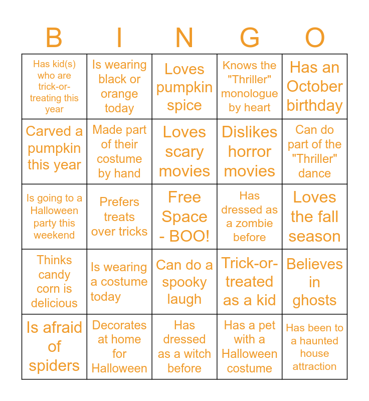This bingo card has a free space and 24 words: Is wearing a costume today, Decorates at home for Halloween, Loves scary movies, Is afraid of spiders, Has an October birthday, Has kid(s) who are trick-or-treating this year, Carved a pumpkin this year, Is wearing black or orange today, Has dressed as a zombie before, Can do a spooky laugh, Dislikes horror movies, Is going to a Halloween party this weekend, Trick-or-treated as a kid, Believes in ghosts, Made part of their costume by hand, Has a pet with a Halloween costume, Loves the fall season, Loves pumpkin spice, Can do part of the "Thriller" dance, Prefers treats over tricks, Has been to a haunted house attraction, Thinks candy corn is delicious, Knows the "Thriller" monologue by heart and Has dressed as a witch before.