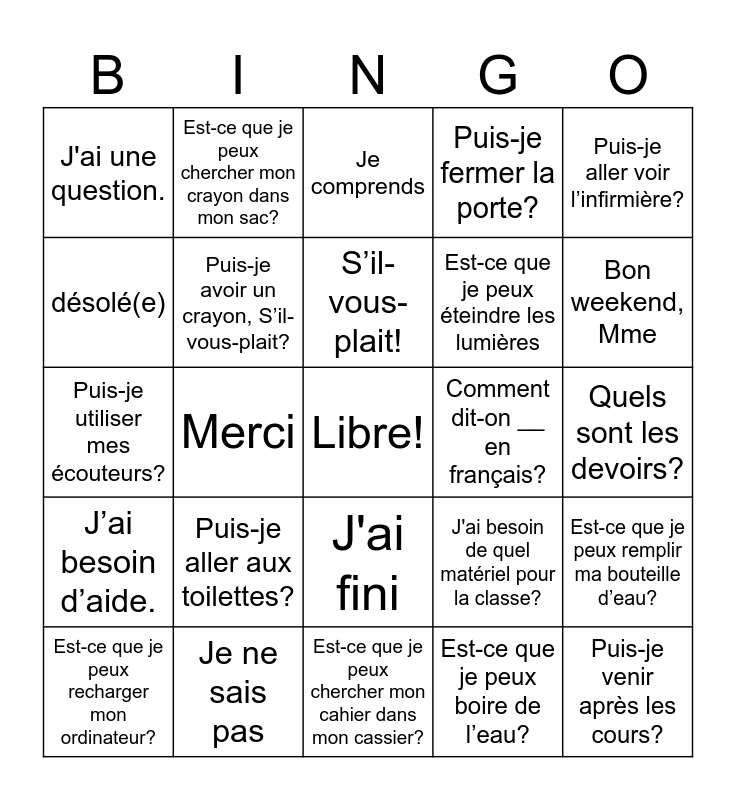 This bingo card has a free space and 24 words: Puis-je aller aux toilettes?, Je ne sais pas, S’il-vous-plait!, Est-ce que je peux recharger mon ordinateur?, Puis-je aller voir l’infirmière?, J'ai une question., désolé(e), Est-ce que je peux chercher mon crayon dans mon sac?, Comment dit-on __ en français?, J'ai fini, Est-ce que je peux éteindre les lumières, Puis-je utiliser mes écouteurs?, J'ai besoin de quel matériel pour la classe?, Est-ce que je peux remplir ma bouteille d’eau?, Puis-je avoir un crayon, S’il-vous-plait?, Est-ce que je peux boire de l’eau?, Quels sont les devoirs?, Je comprends, Bon weekend, Mme, Merci, Puis-je venir après les cours?, J’ai besoin d’aide., Puis-je fermer la porte? and Est-ce que je peux chercher mon cahier dans mon cassier?.