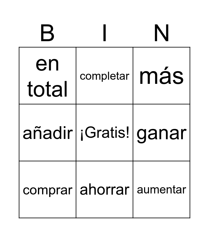 This bingo card has 2 images, a free space and 15 words: más, en total, me regalan, añadir, juntar, comprar, ahorrar, ganar, reunir, encontrar, aumentar, completar, poner, llegaron and vinieron.